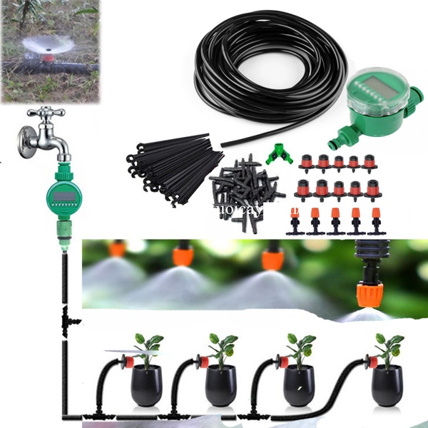 Bộ kit bao gồm: 20 béc phun 8 tia điều chỉnh, 19 T chia nhánh, 20m ống PE 4x6mm, 1 van hẹn giờ dùng pin.