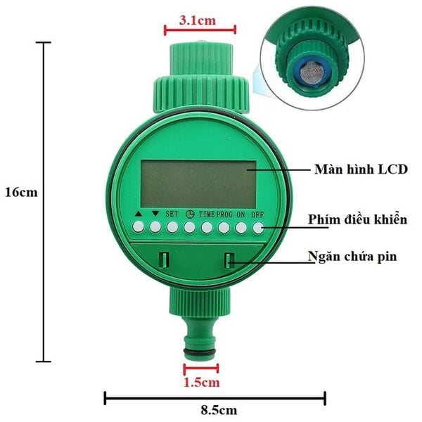 | Tự Động Hóa Hoàn Toàn | Van hẹn giờ dùng pin tích hợp 16 chương trình cài đặt linh hoạt. Bạn chỉ cần thiết lập lịch tưới (thời gian bắt đầu, thời gian tưới, tần suất), hệ thống sẽ tự hoạt động. Lý tưởng cho người đi công tác, du lịch hoặc quá bận rộn. |